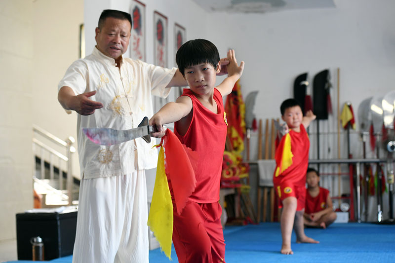 7月21日,在江西省宜春市袁州区南庙镇白马村乡村武馆,孩子在武术教练的指导下进行武术器械练习。