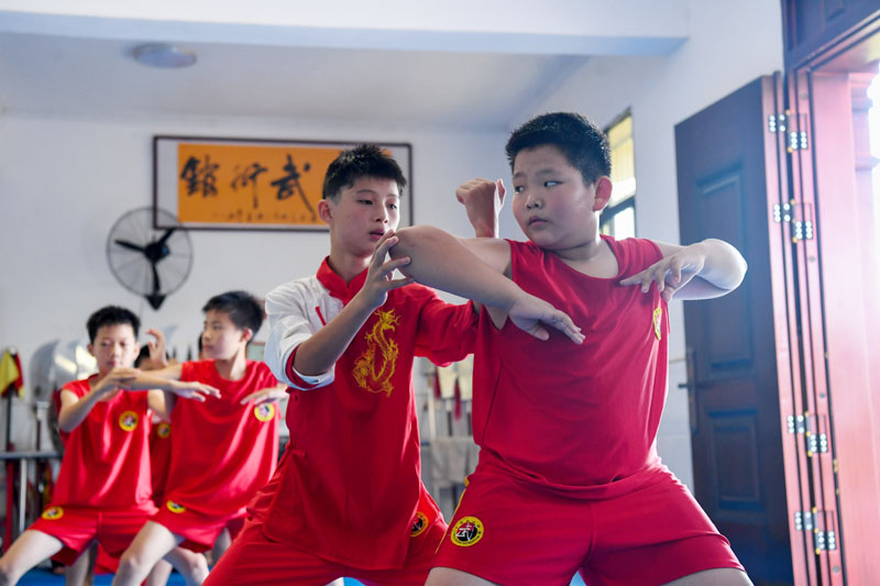7月21日,在江西省宜春市袁州区南庙镇白马村乡村武馆,孩子们在进行武术套路练习。