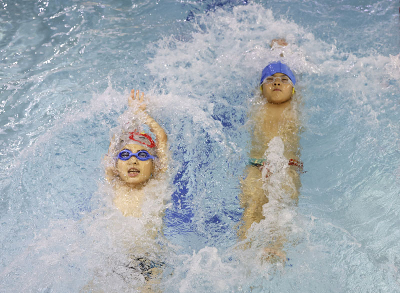 7月21日,学生在山东省枣庄市一家游泳馆内练习游泳。