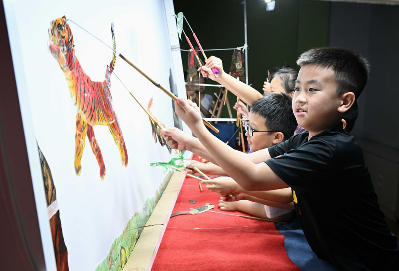 7月21日,小朋友在河北省石家庄市桥西区冀台联文化产业园体验皮影戏表演。