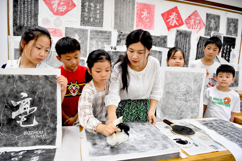 7月20日,在安徽省亳州市文化馆,孩子们在老师的指导下学习拓片技艺。