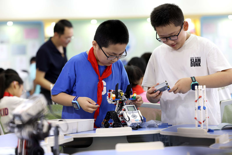 7月21日,在安徽省合肥市郎溪路小学少年宫,孩子们在暑期科创课上组装机器人。
