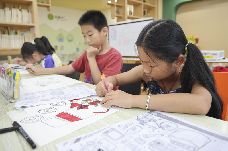 7月21日,在山东省临沂市兰山区银雀山街道东苗庄社区暑假托管班,孩子们在学习绘画。