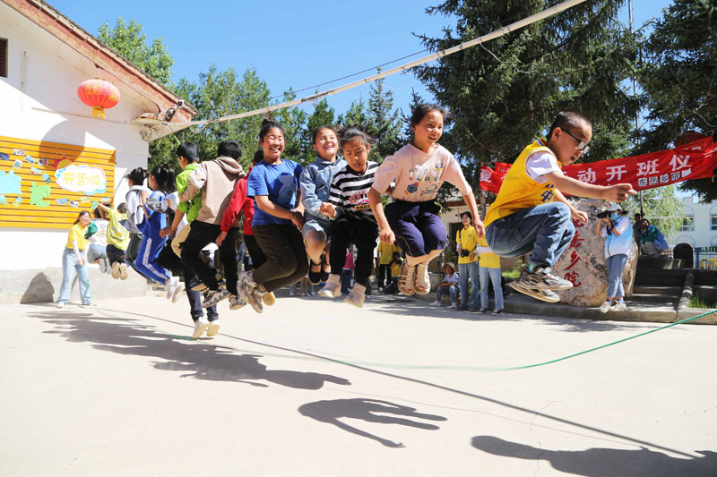 7月21日,在甘肃省定西市安定区内官营镇东岳村,孩子们参加乡村夏令营的跳绳比赛。