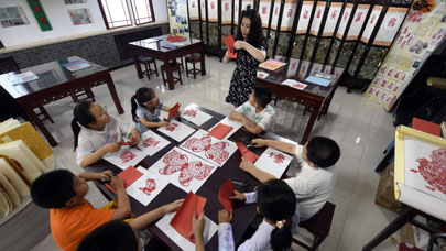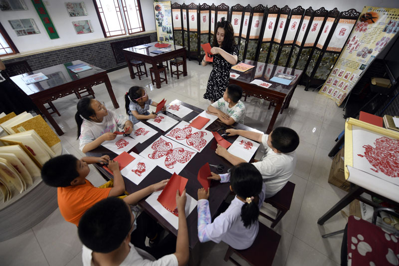 7月21日,在河北省丰宁县暑假“非遗小课堂”,丰宁县第一小学教师任洪茹为学生讲解剪纸技艺。