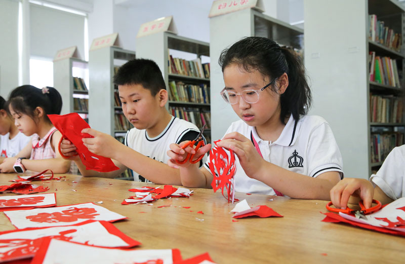 7月21日,在江苏省连云港市连云区海州湾街道大港社区非遗公益课堂上,孩子们在学习剪纸技艺。
