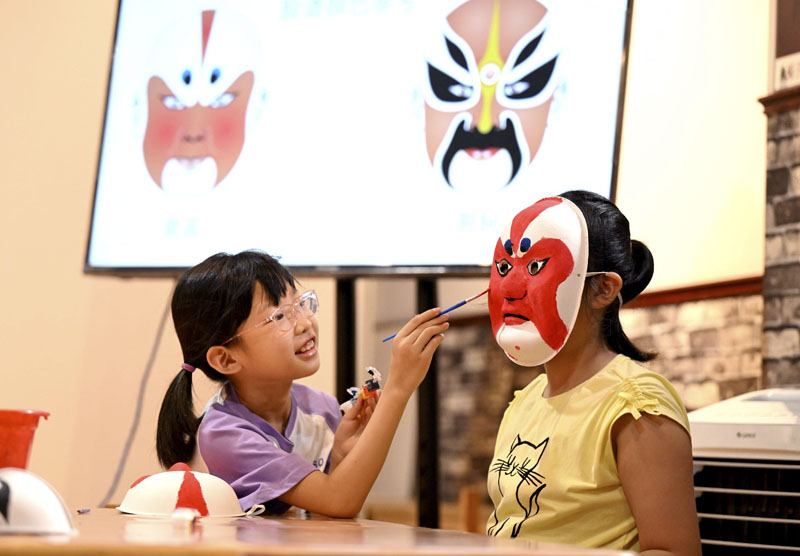 7月21日,小朋友在河北省石家庄市桥西区冀台联文化产业园学习脸谱制作技艺。