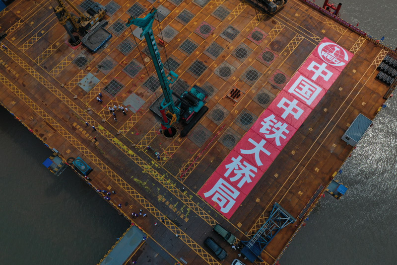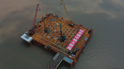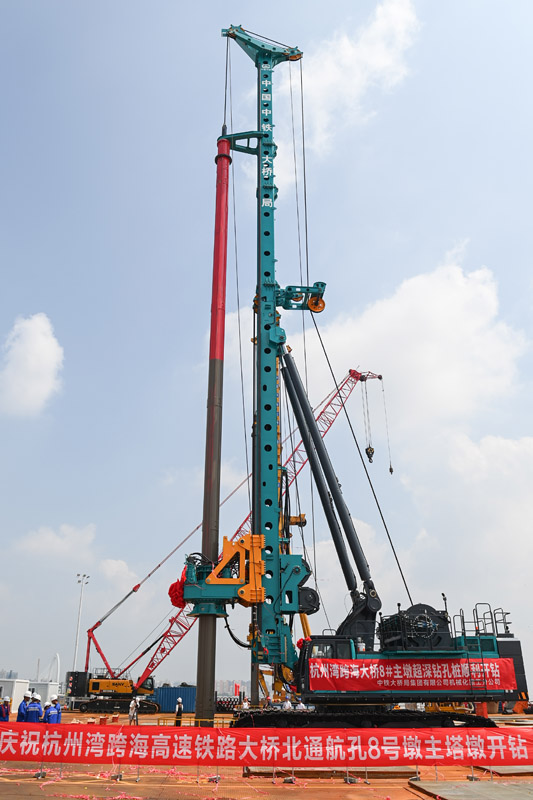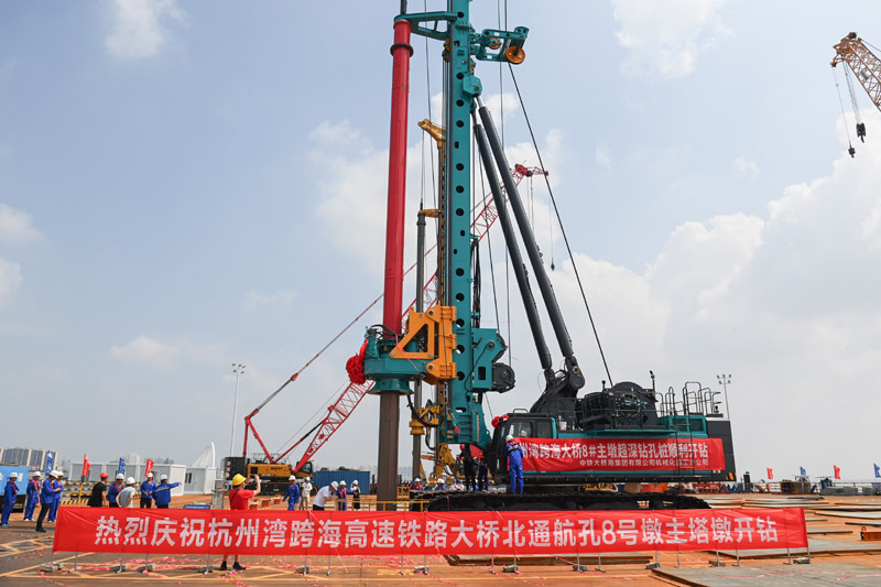 杭州湾跨海铁路桥全长29.2公里,包括北、中、南3座航道桥和跨大堤、海中、浅滩区引桥,属超长高速铁路桥梁集群工程。此次中铁大桥局施工的北航道桥8号主塔墩钻孔桩率先开钻。