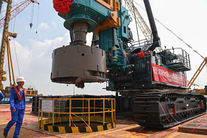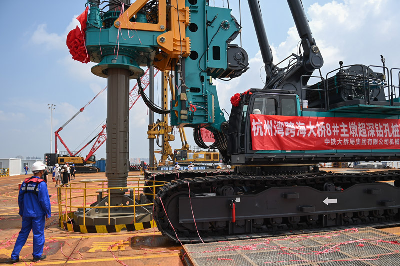 8月10日,中铁大桥局施工人员在杭州湾跨海铁路桥北航道桥主塔墩钻孔桩施工平台操作旋挖钻机作业。