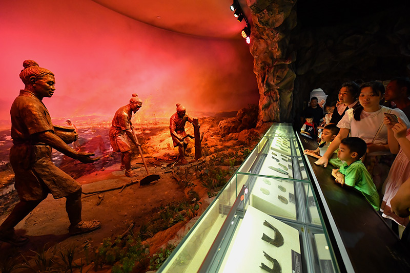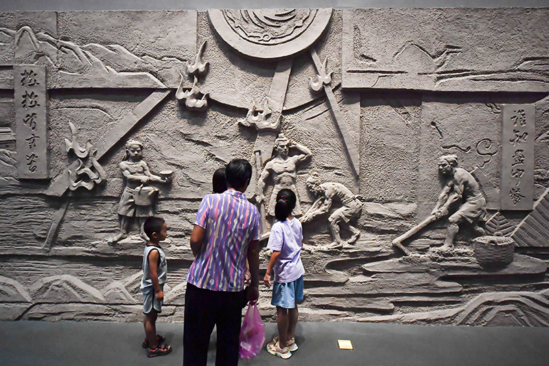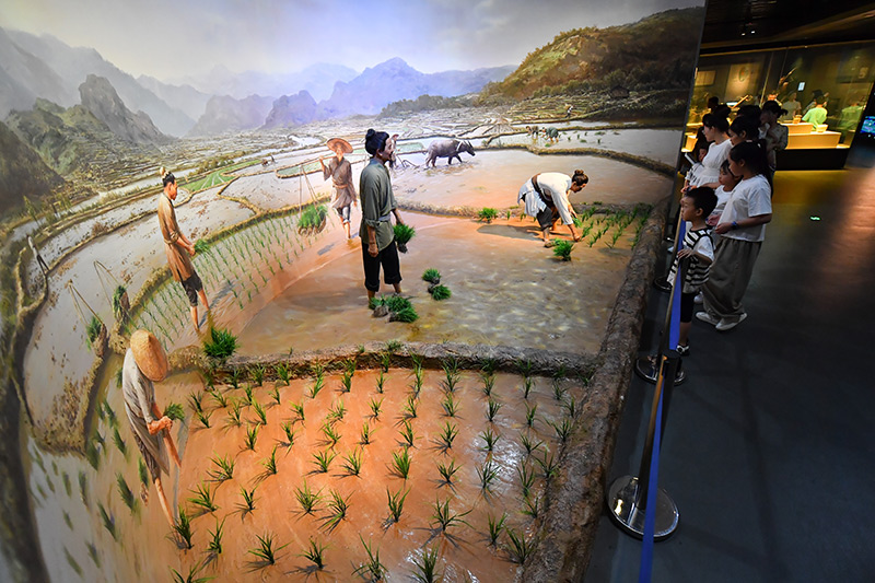 8月26日,在长沙市芙蓉区的隆平水稻博物馆,家长带着孩子参观传统农业耕作场景。