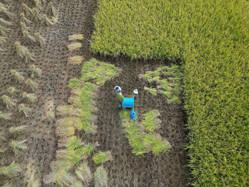 9月6日,贵州省黔东南苗族侗族自治州丹寨县扬武镇五一村的村民在田间收获稻谷(无人机照片)。