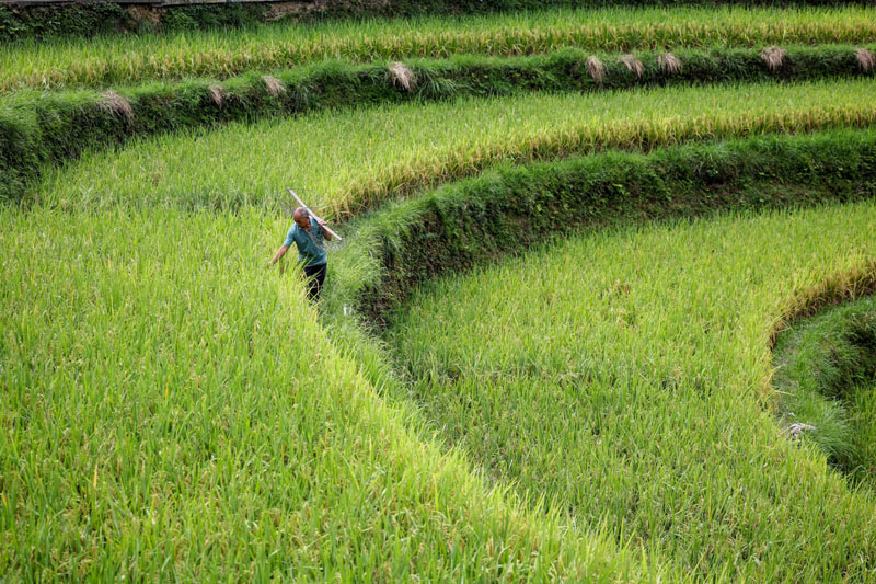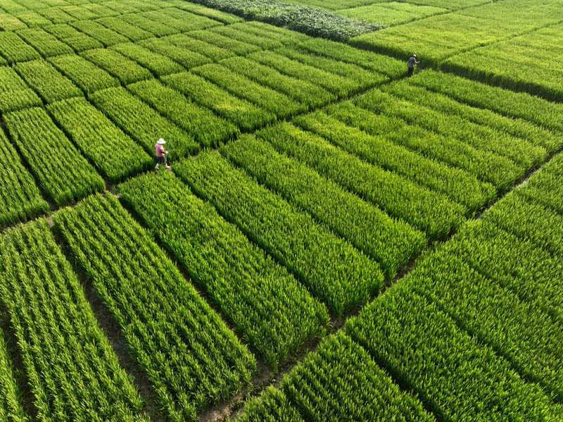 9月7日,村民在贵州省黔东南苗族侗族自治州丹寨县排调镇党干村查看水稻长势。