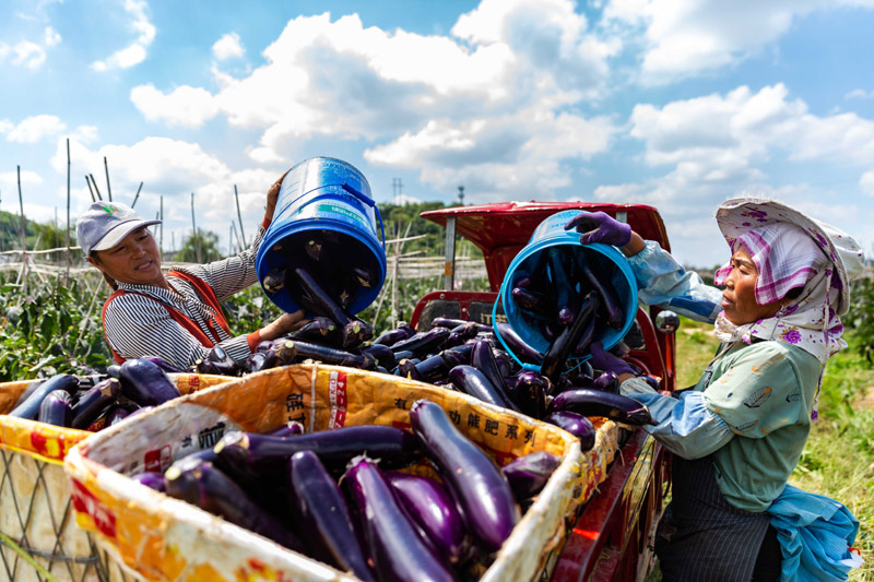 9月7日,在河北省石家庄市栾城区鲁家庄村,茄农将收获的茄子装箱,准备运往市场销售。