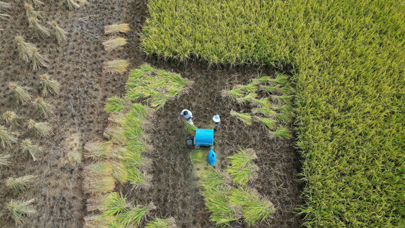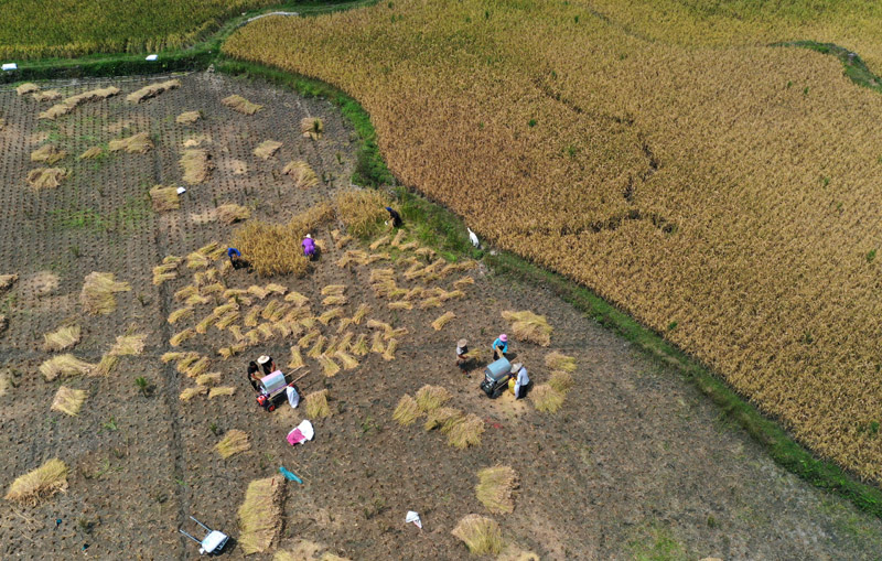 9月7日,村民在贵州省开阳县禾丰乡马头村收割水稻(无人机照片)。