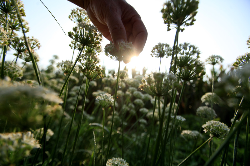 9月6日,在山东省临沂市平邑县地方镇黄城村,村民在采摘韭菜花。