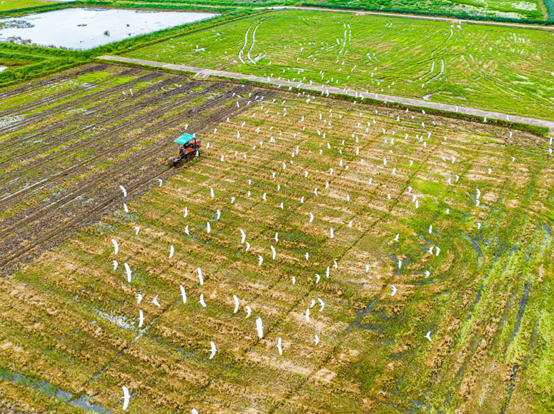 9月7日,浙江省温岭市石桥头镇土坦新村,农民驾驶农机翻耕整地,成群的白鹭跟随农机觅食、飞舞(无人机照片)。