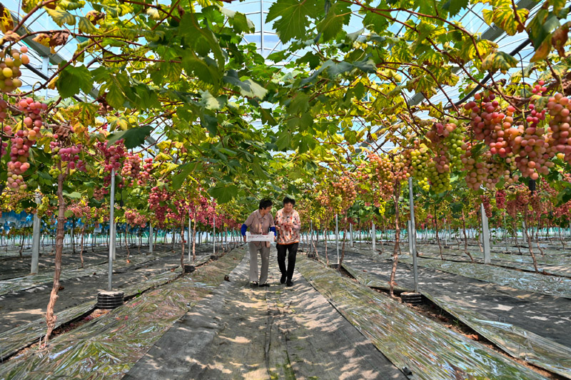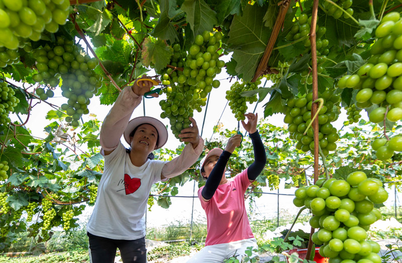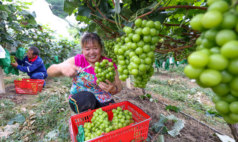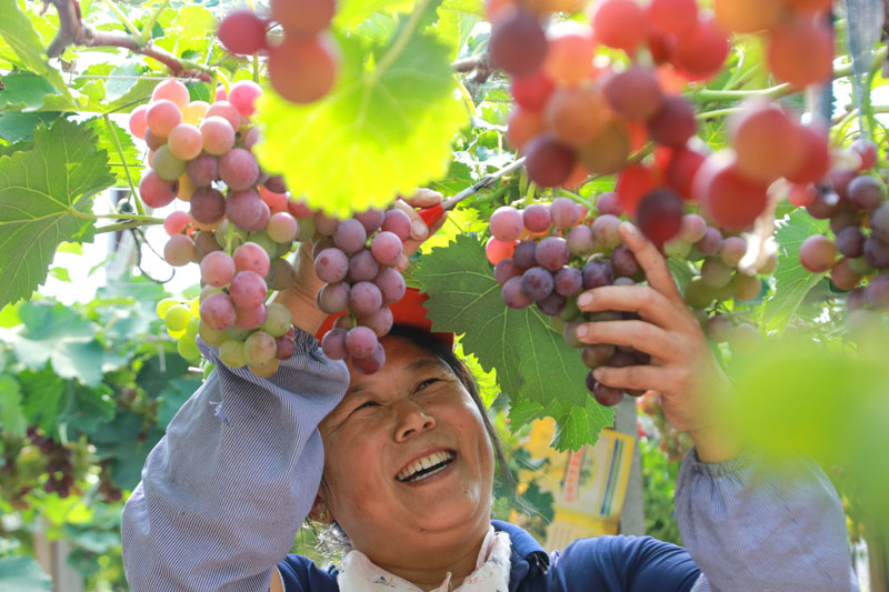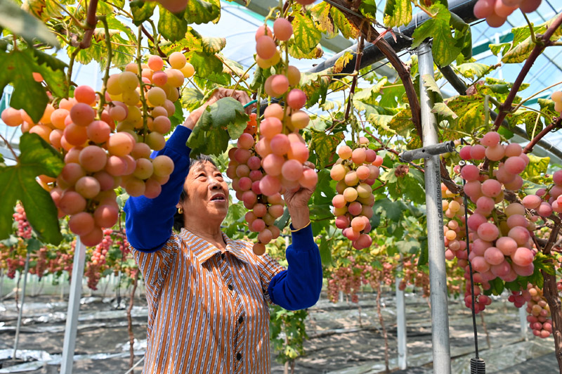 9月7日,山东省高密市阚家镇松兴屯村葡萄大棚内,村民在采摘葡萄。