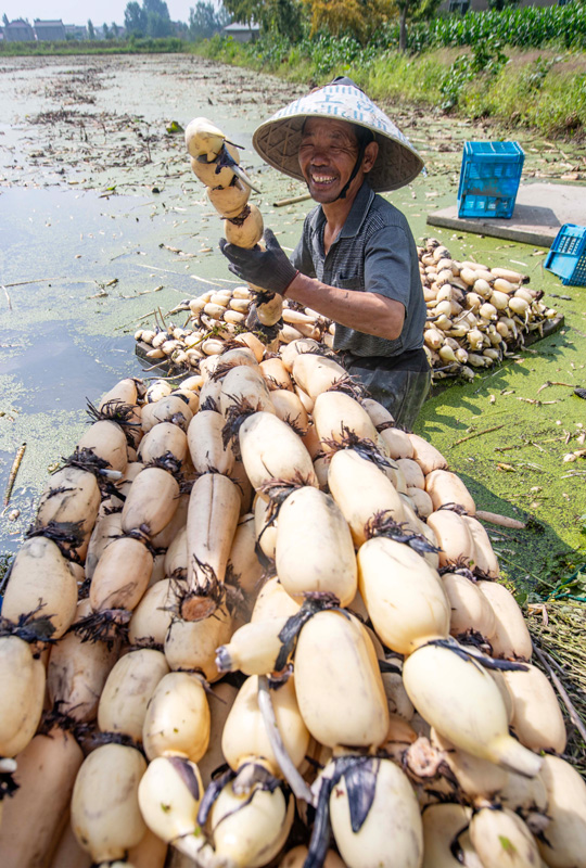 9月7日,农户在江苏省泰州市姜堰区顾高镇夏庄村莲藕种植基地分拣采收的莲藕。
