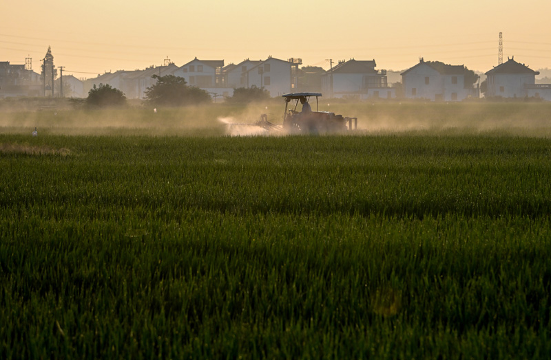9月7日,农机手在江苏省昆山市锦溪镇三联村双娄里稻田喷施农药。