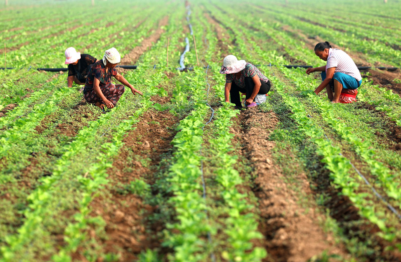 9月7日,在河北省石家庄晋州市东里庄镇仁义村的千亩白菜种植基地,农户对白菜秧苗进行除草疏苗作业。