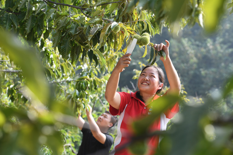 9月7日,河北省石家庄市平山县北滚龙沟村农民在山里采收板栗。