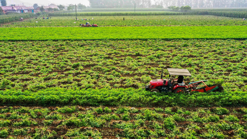 9月6日,河北省遵化市刘备寨乡安各寨村农民驾驶农机收获花生(无人机照片)。