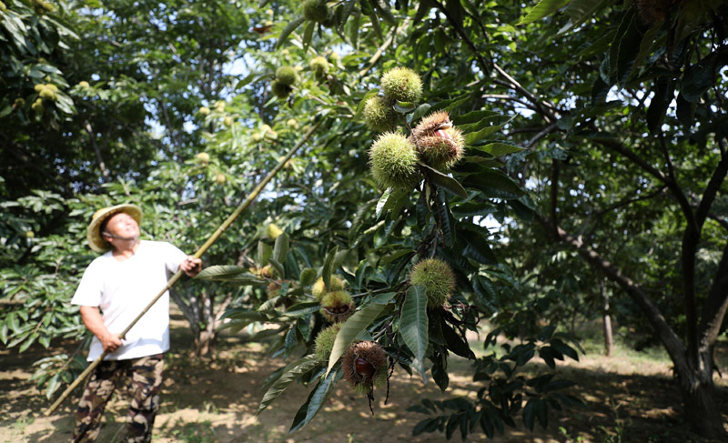 9月6日,山东省临沂市郯城县郯城街道吕港口村村民在采收板栗。