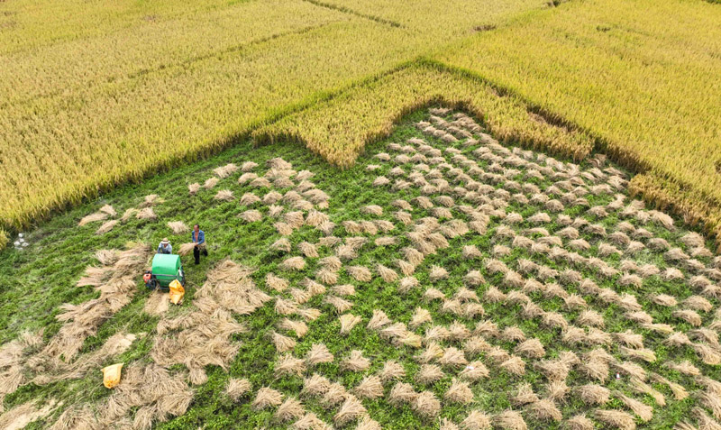 9月6日,农民在贵州省遵义市余庆县白泥镇满溪村收获稻谷(无人机照片)。
