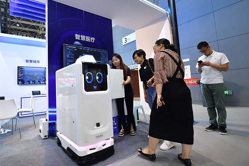 9月8日,工作人员(左一)在数博会上向参观者介绍医疗物资配送机器人。