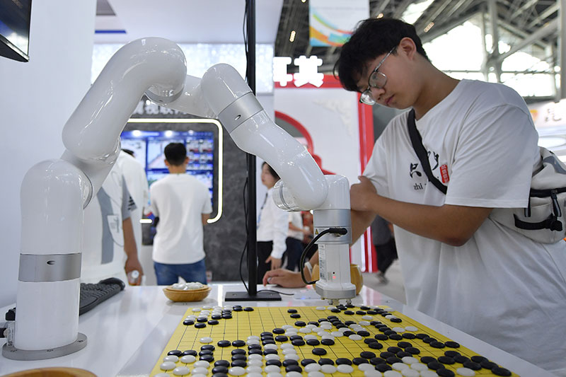 9月6日,参观者在数博会上与5G智能机器人下围棋。