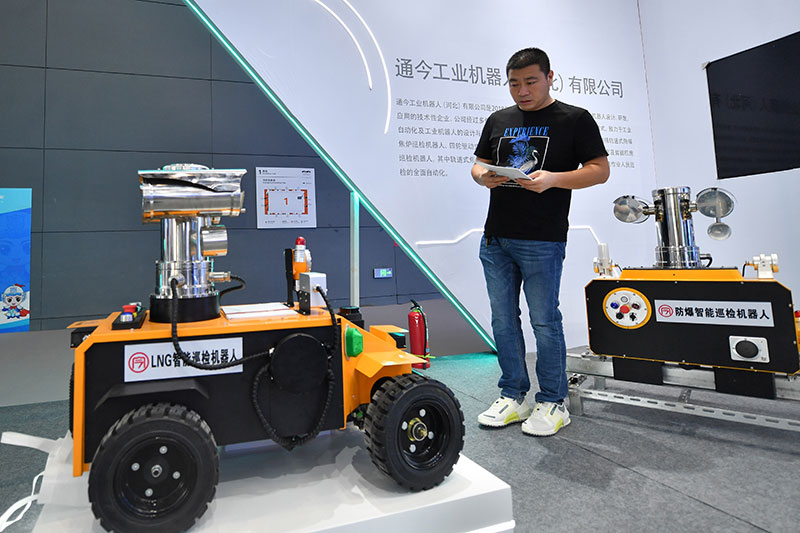 9月7日,参观者在数博会上了解LNG智能巡检机器人。