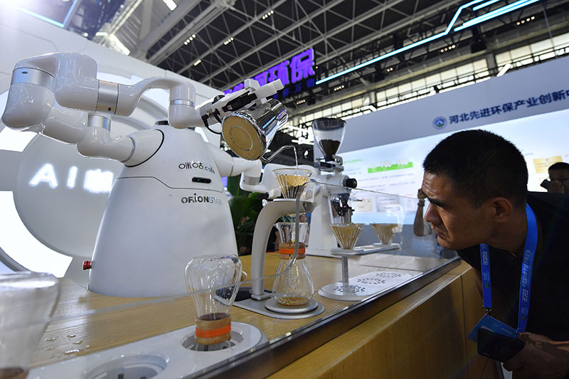 9月6日,参观者在数博会上观看AI咖啡手冲机器人制作咖啡。