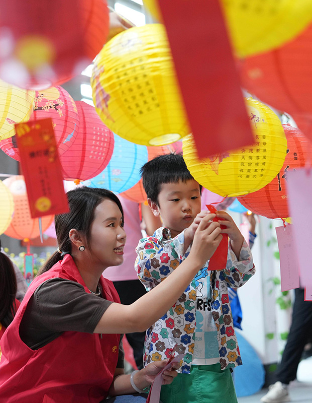 9月26日,在重庆市北碚区澄江镇新时代文明实践站,志愿者和小朋友一起猜灯谜。