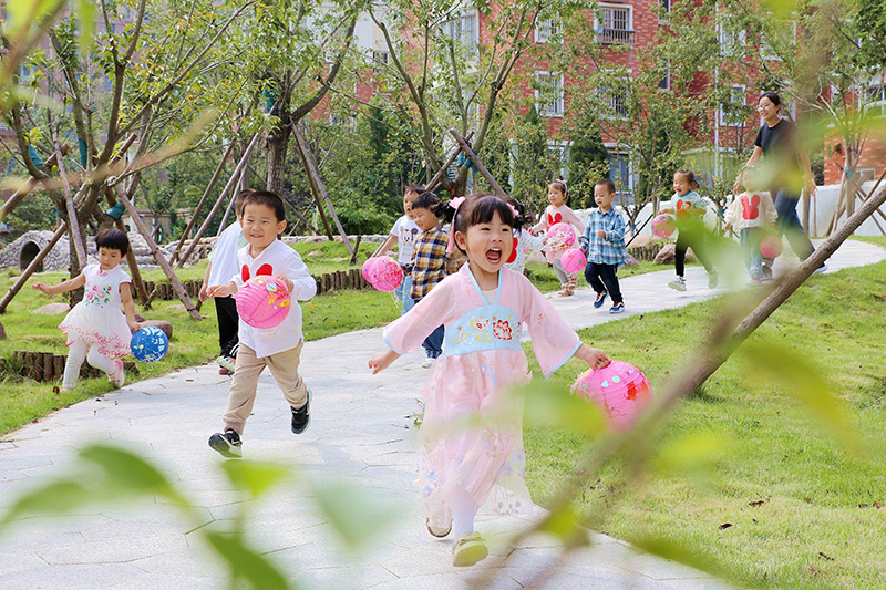 9月26日,山东省青岛西海岸新区金河路幼儿园小朋友提着自制中秋花灯游园。