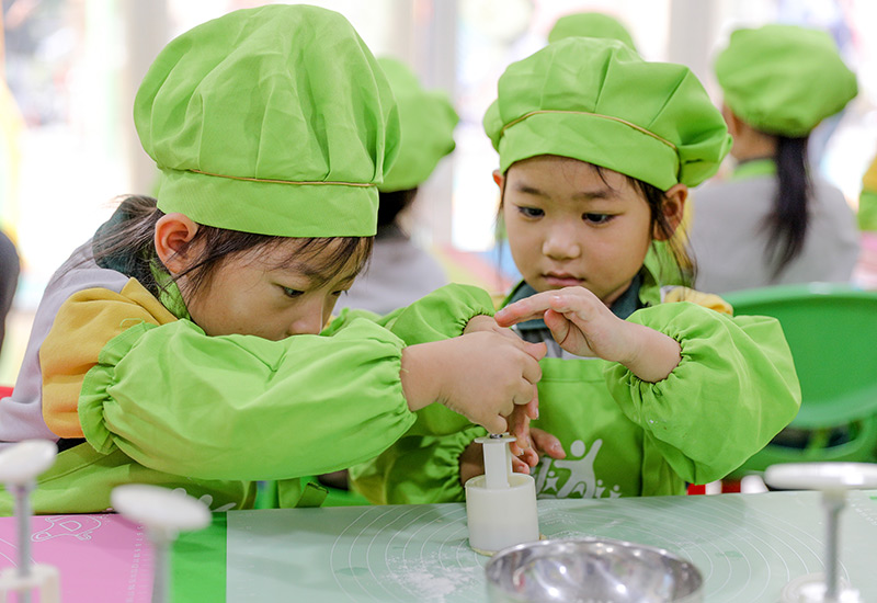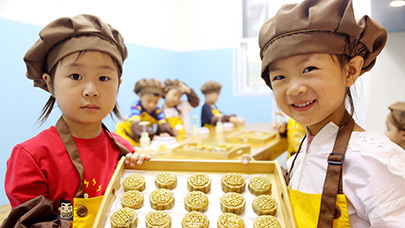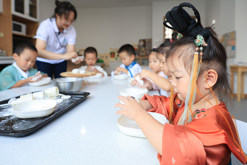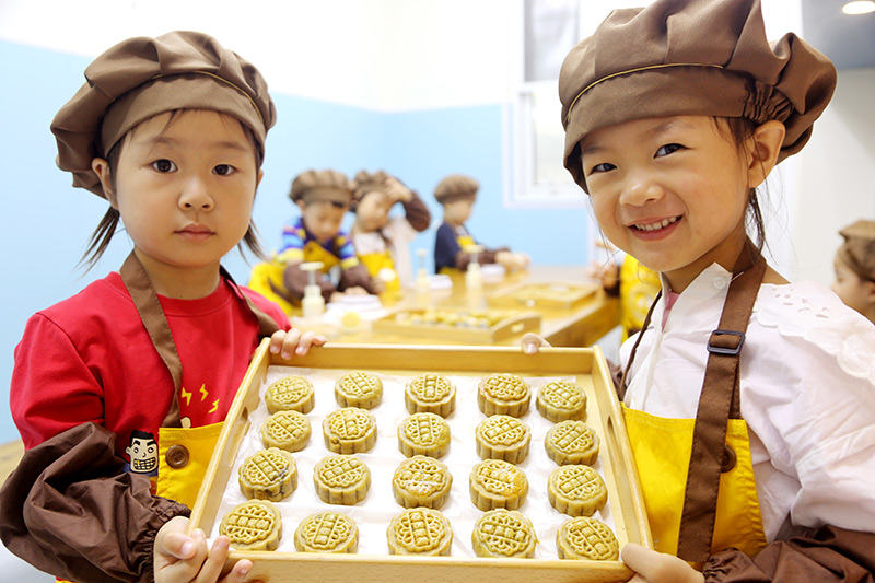 9月26日,江苏省南京市一家幼儿园的小朋友在学习制作冰皮月饼。