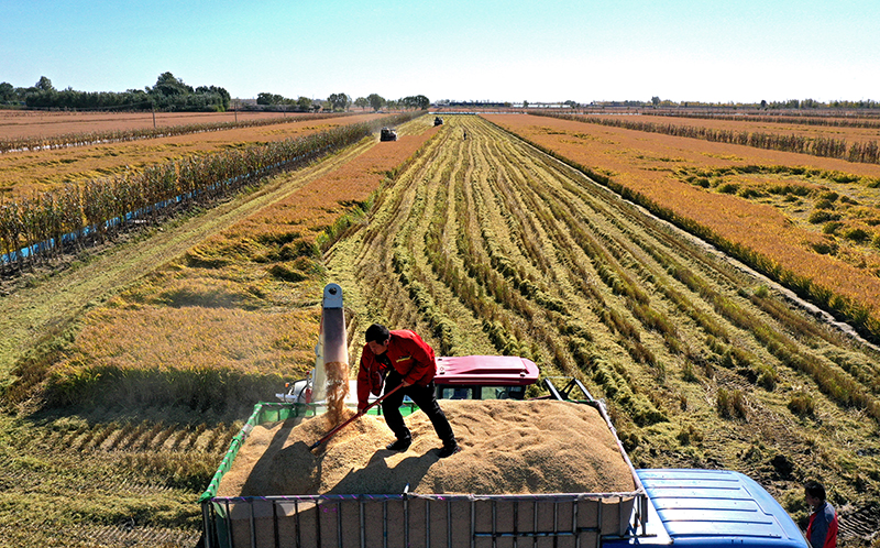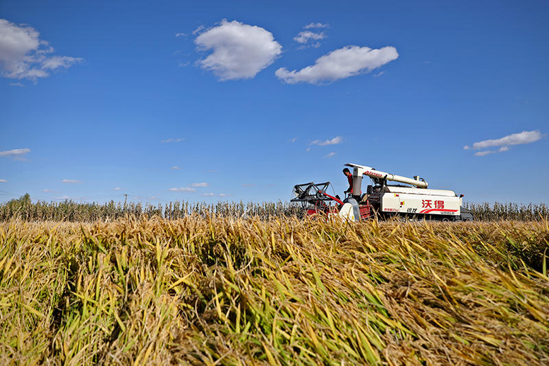 10月20日,农业机械在盘锦市辽河三角洲尤巧元家庭农场的稻田里收割水稻。