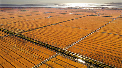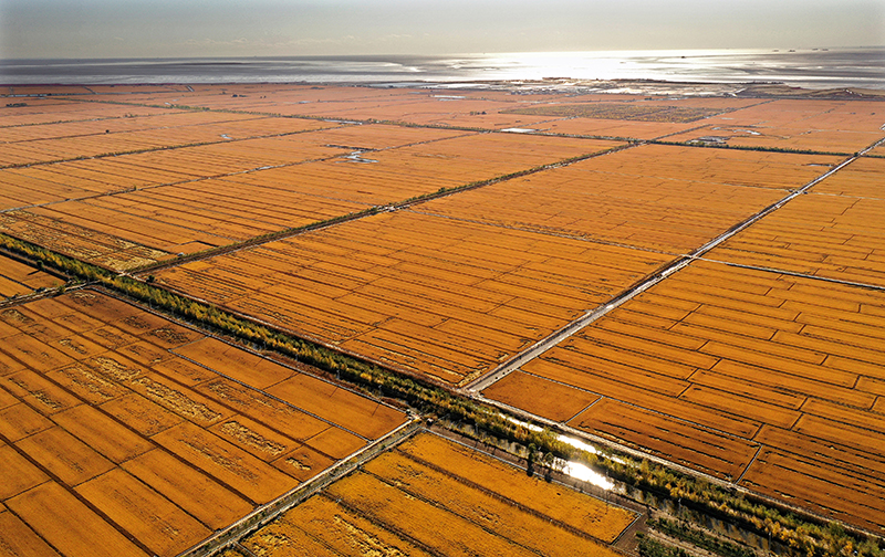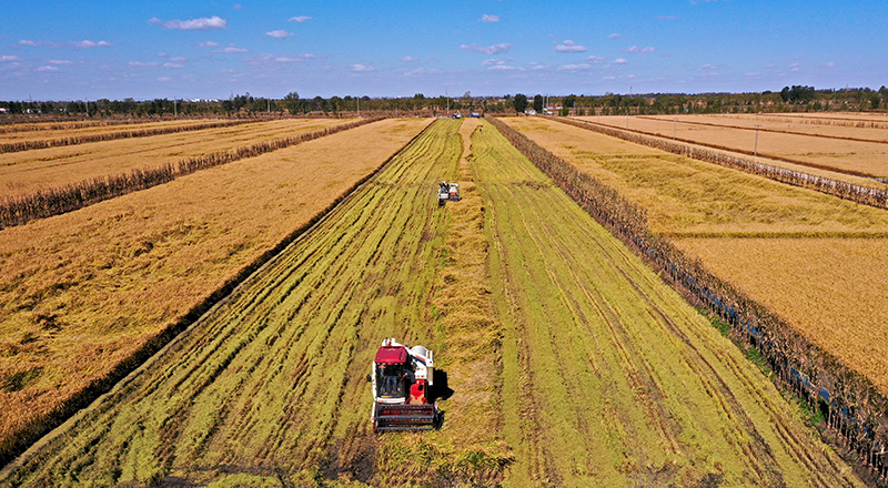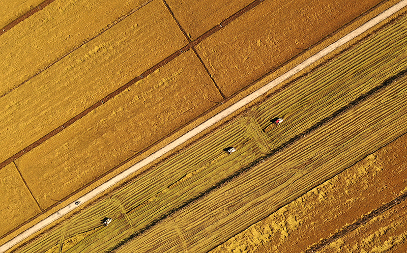 金秋时节,我国水稻主要产区之一——辽宁省盘锦市辽河三角洲水稻产区迎来集中收割季,一台台农机在田野上收割庄稼,空中俯瞰大片田地满目金黄。