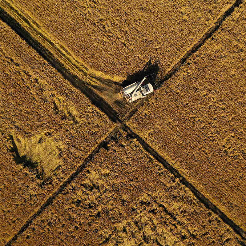 10月20日,一名工人在盘锦市辽河三角洲尤巧元家庭农场的货车里整理刚刚收割装运的水稻(无人机照片)。