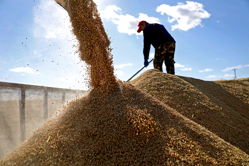 10月20日,一名工人在盘锦市辽河三角洲尤巧元家庭农场的货车里整理刚刚收割装运的水稻。