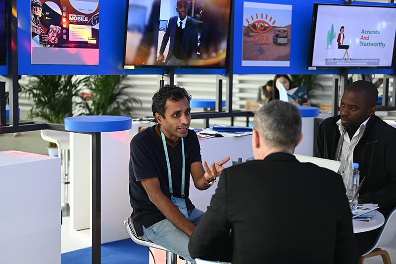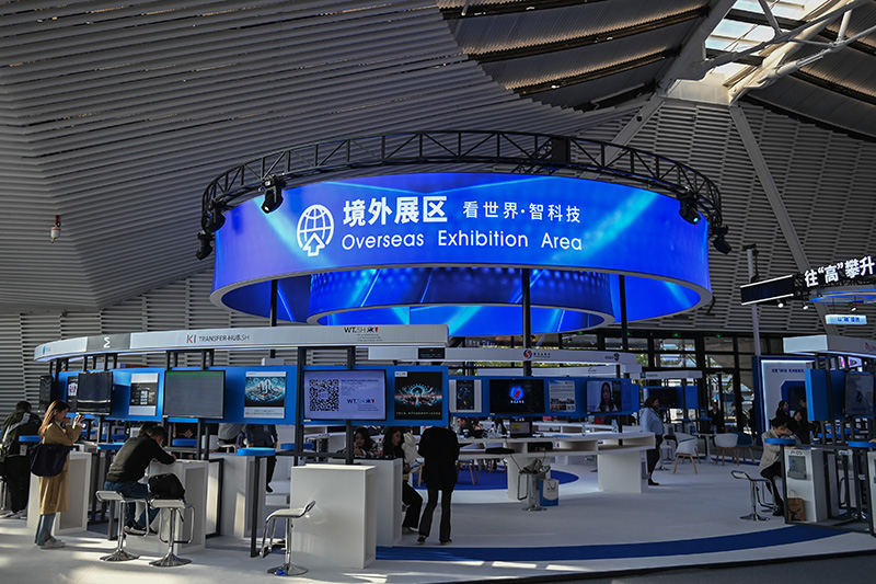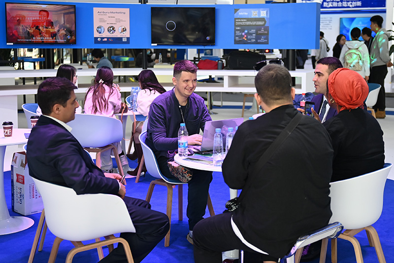 11月7日,“互联网之光”博览会境外展区的参展商代表在洽谈区交流。