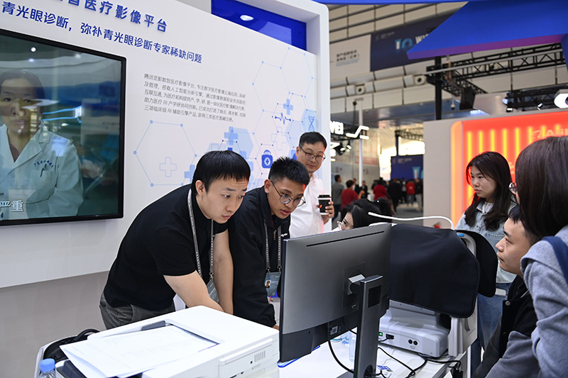 11月7日,观众在腾讯展台了解“觅影”数智医疗影像平台的应用。