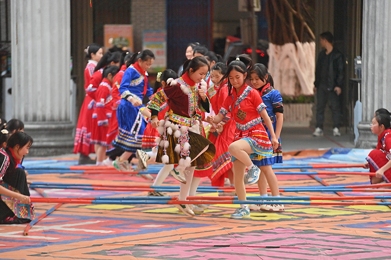 12月28日,在柳州市融安县实验小学,学生们在跳竹竿舞。