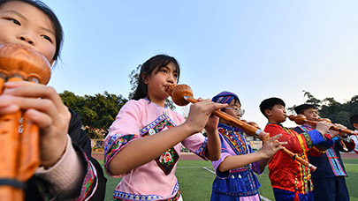 12月28日,在柳州市融安县实验小学,学生们在练习吹奏葫芦丝。