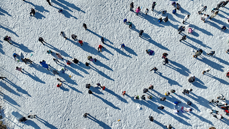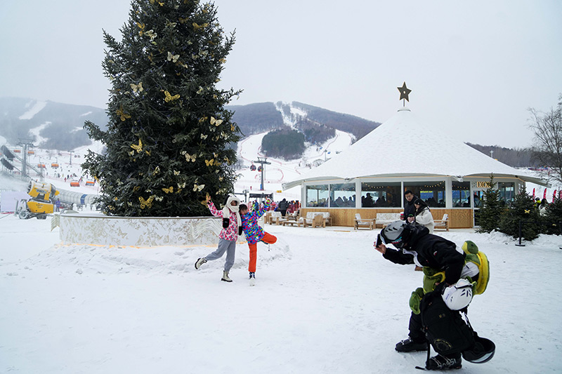 12月30日,游客在吉林省吉林市万科松花湖度假区拍照留念。