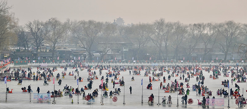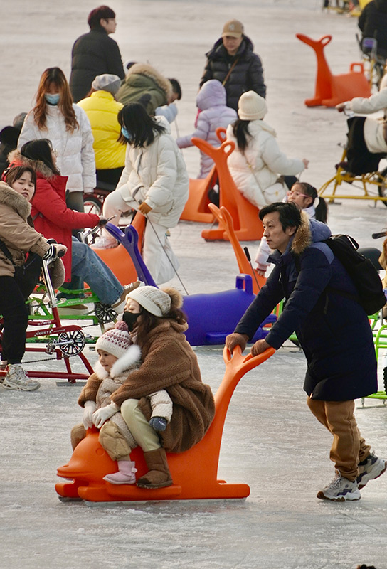 12月30日,游人在北京什刹海冰场体验冰上运动。