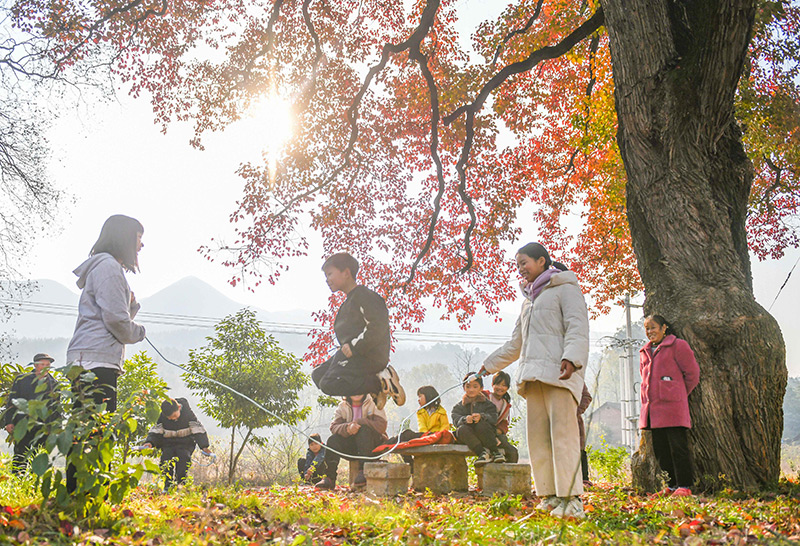 12月30日,在湖南省永州市道县梅花镇修义村,小朋友在乌桕树下玩耍。