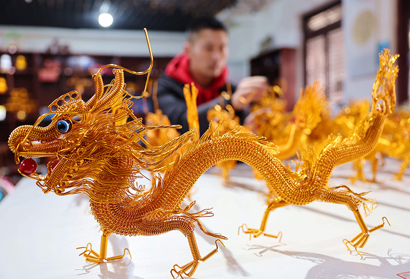 12月30日,在山东省临沂市沂南县红石寨非物质文化遗产博物馆,铝编艺人蔡兆旺在创作“金龙献瑞”铝编作品。