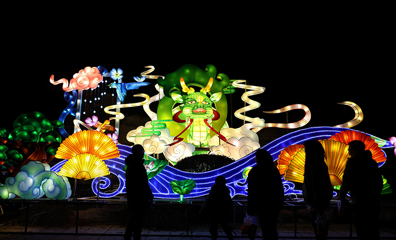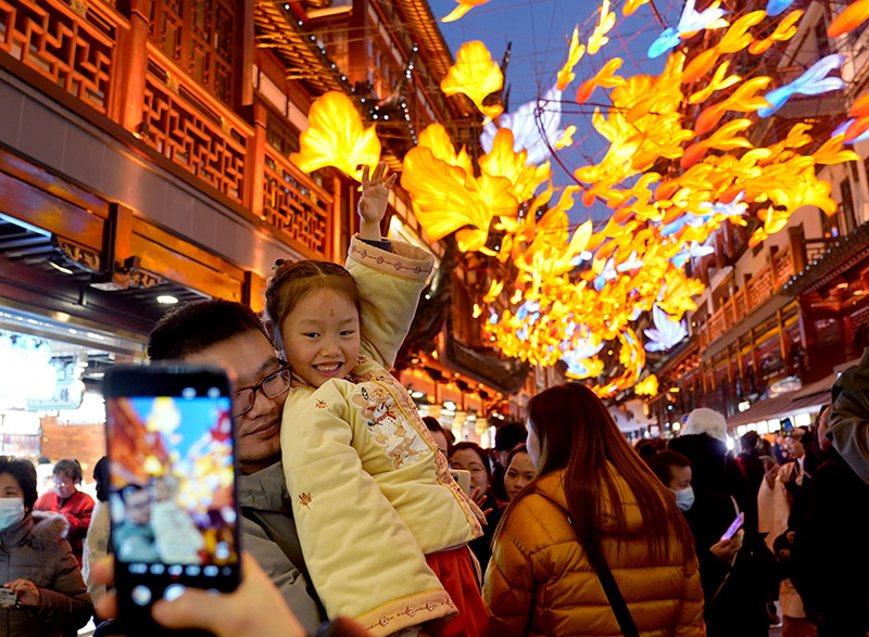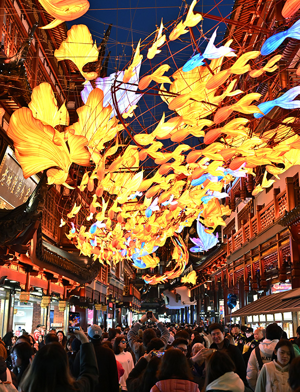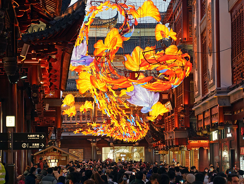 12月30日在上海豫园商城拍摄的“一夜鱼龙舞”主题灯组与观灯人潮。
