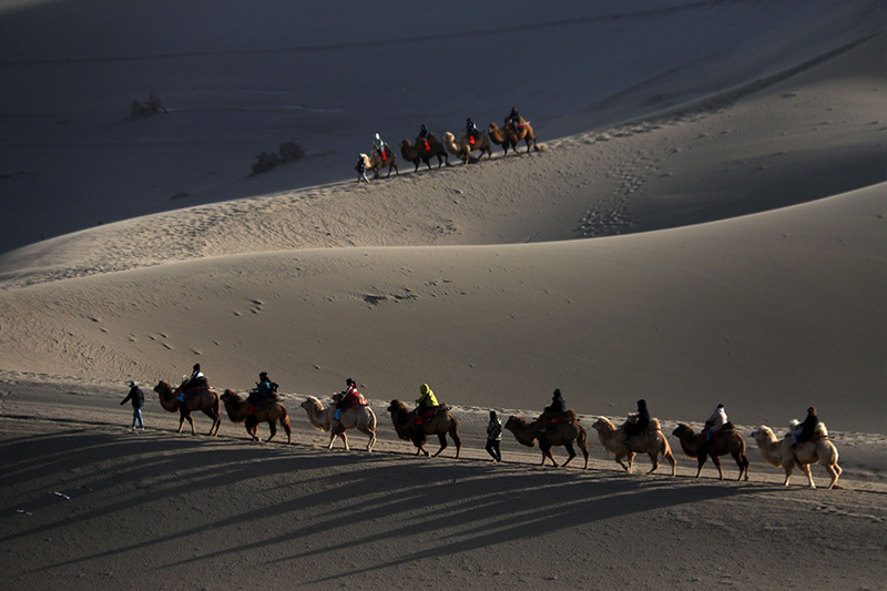 12月30日,游客在甘肃省敦煌市鸣沙山月牙泉景区游览。