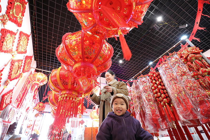12月30日,人们在河南省焦作市温县赵堡镇年画市场选购红灯笼。